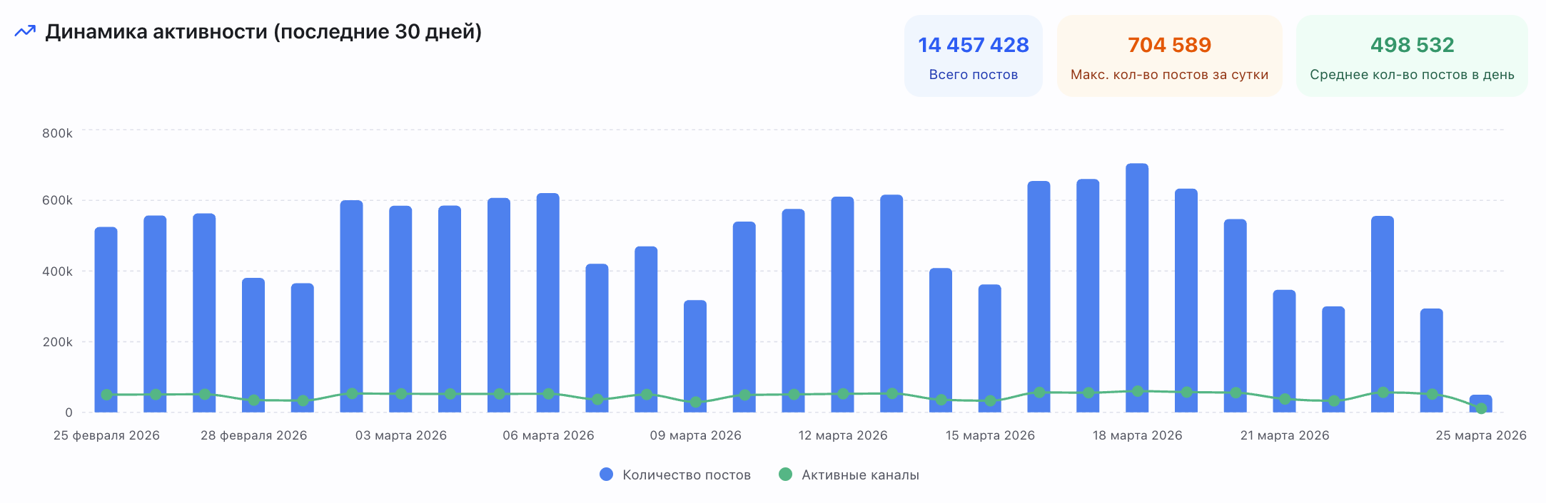 Активность всей платформы за последние 30 дней (актуально на 26 марта 2026): опубликовано 14 457 428 постов, максимум за одни сутки составил 704 589 публикаций, среднесуточный показатель — 498 532 поста, среднее число активных каналов в месяц — около 33 000. Это живая платформа с реальным контентом, а не пустая оболочка.