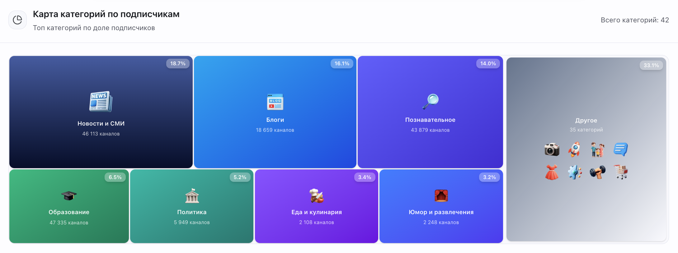 Ниже представлена карта категорий по подписчикам 👇 (Топ категорий по доле подписчиков)
